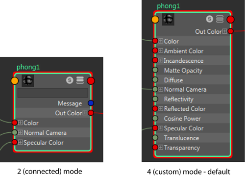 When you first create a node in the Hypershade work area, its most commonly used attributes are displayed (hotkey 4 mode in the Node Editor). You can display nodes in the Hypershade in the same view modes as you can in the Node Editor: 1 (simple), 2 (connected), 3 (full), 4 (custom). You can also use hotkey 5 to display the node type instead of its name, or not to show a node title at all.