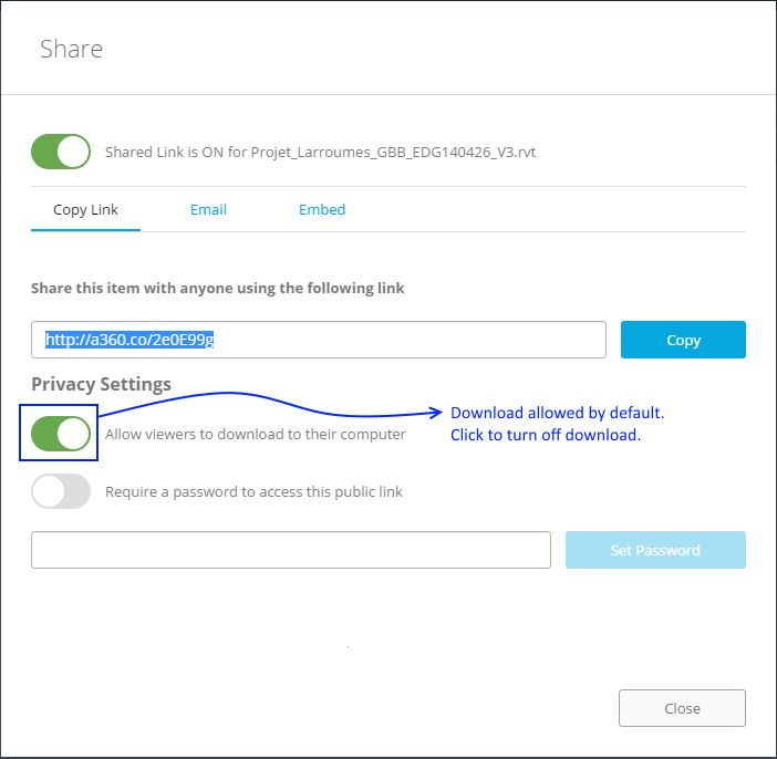 Note: When sharing a link to a file, anyone with the link can view the file unless you set a password for the link.