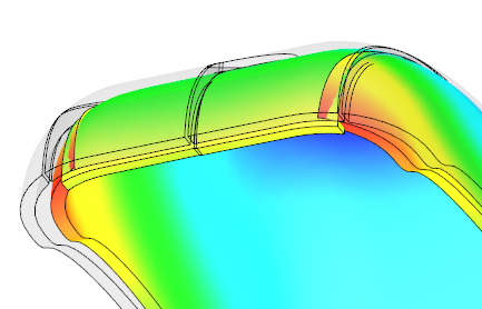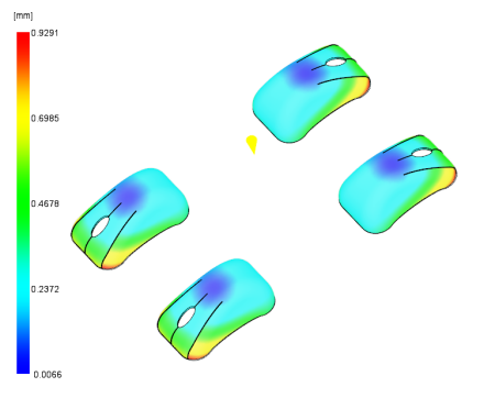 This result seems to indicate that the deflection would cause the four separate sections to overlap and extend through each other. This is not possible. The result shows the magnitude of the unconstrained deflection of the part. In reality, these four sections would physically interact causing additional distortion.