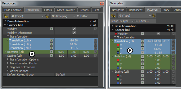 Property lists A. Property list in the Properties window B. Property list in the FCurves window