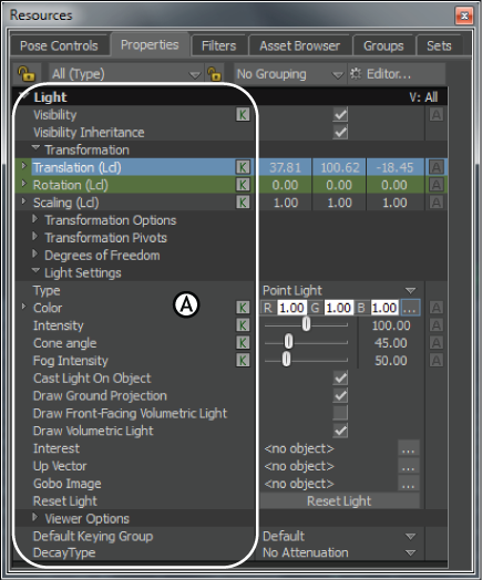 Properties window A. Selected light’s properties