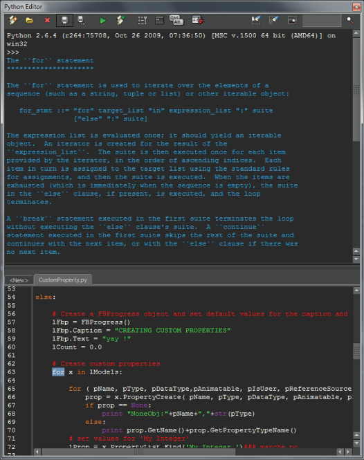 in the Python Editor toolbar or by using the F1 keyboard shortcut. The information displayed in the context Help depends on whether or not the interactive console is populated, whether you selected text in the interactive console or in the active work area, or whether or not the cursor is positioned at the end of a line of code in the interactive console.