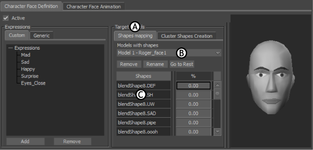 Character Face Settings A. Shapes Mapping pane B. Models with shapes menu C. Shapes list