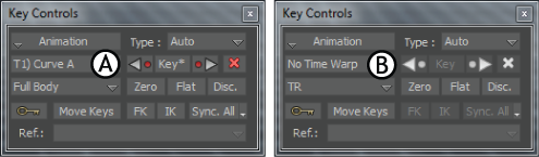 Key Controls window A. TimeWarp curve name B. TimeWarp is active, but there is no TimeWarp curve