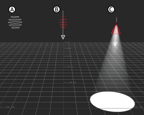 Shines light in a specific direction from one position in your scene. The current color of the light is shown by the light ray, an arrow indicating the light’s direction and the ground projection. The range of the light is defined using a Cone Angle.