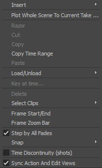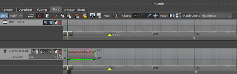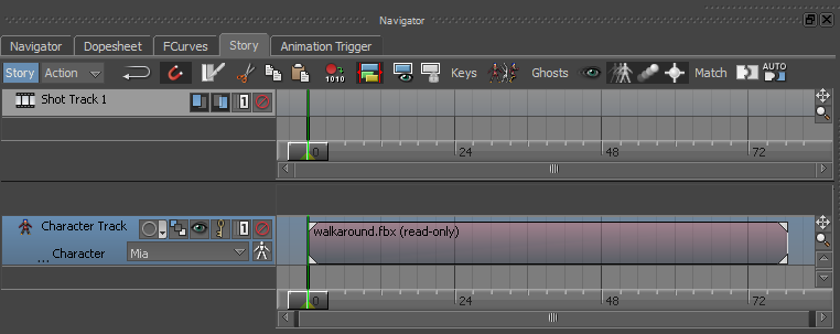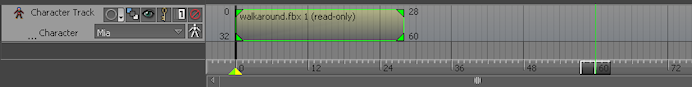 After framing the Walkaround clip, the Character Track is highlighted in blue indicating it is selected, and the Walkaround clip is no longer shown as being selected.