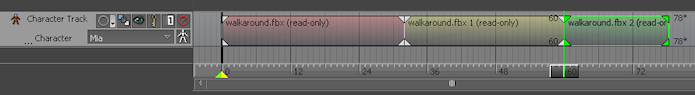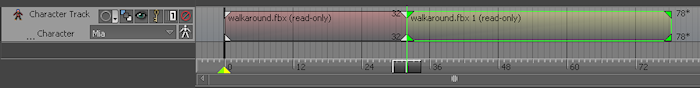 The values at the top left and right of the Walkaround clip (number "0" and number "78") indicate at what frame the clip starts and ends and the values at the bottom left and right of the Walkaround clip (number "0" and number "78") identify the original clip's start and end. Since the clip has not been modified, the top and bottom values are identical.