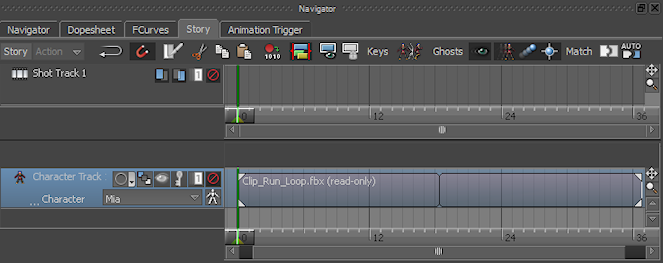 After framing the Clip_Run_Loop.fbx clip, the Character Track is highlighted in blue indicating it is selected, and the Clip_Run_Loop.fbx clip is no longer shown as being selected.