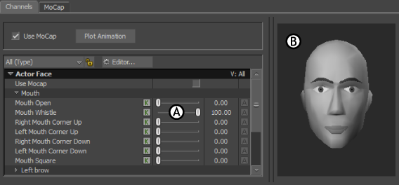 A. The channel slider for Mouth-Whistle is at 100%. B. The full value of the channel displays on the Preview model.
