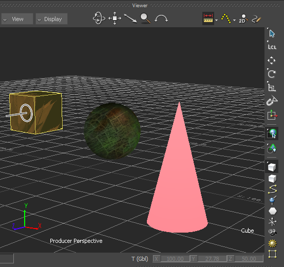Setting the Display mode to Normal, X-Ray, Models Only, or Models Display Wireframe mode enables you to see objects and models, their bounding box centre (displayed as a Magenta hexagon), and their Rotation and Scaling pivots.