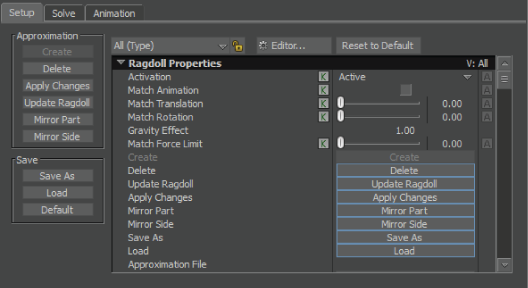 The All Ragdoll Properties (Type) settings let you configure the settings for the Setup, Solve, and Pose Matching.