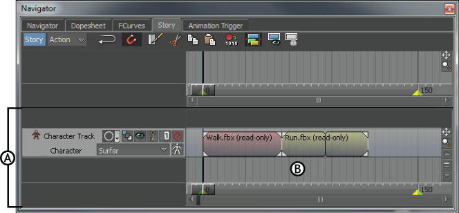 Story window A. Action Track list B. Action Track controls area C. Action Clip area D. Resizing bar