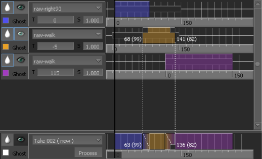 For example, if you are blending two takes using one cut from the “raw-right90” take and two cuts from the “raw-walk” take, you should have three tracks in total: one track for “raw-right90” and two tracks for “raw-walk”.