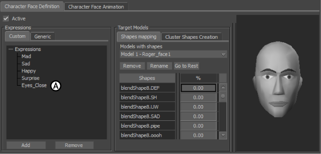 Use the Custom pane in the Expressions area to define your own custom expressions. Custom expressions can be whatever facial expressions your project requires, including expressions that represent phonemes and are linked to the Voice device.