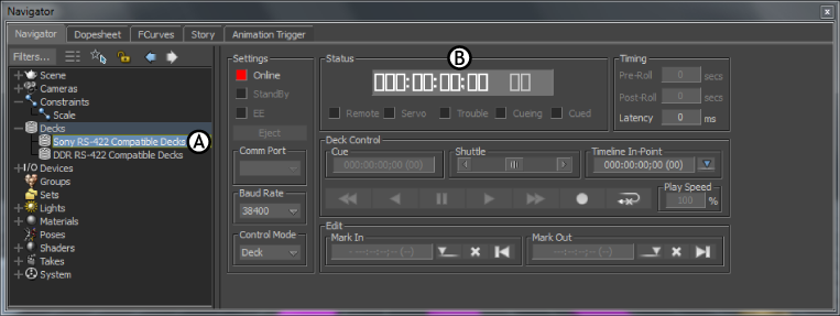When the selected VTR is in Remote Control mode, the Decks Transport Controls are active and MotionBuilder controls the VTR.