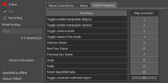 SpaceBall device settings, Button Mapping pane