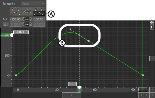 Break/Unbreak tangents optionA. Option is in active mode B. Tangent handles of a selected keyframe are broken. Each handle moves independently.