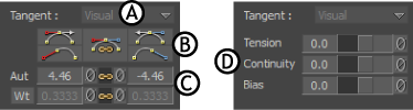 Tangent area A. Tangent menu B. Flat, Discontinuity, and Break options C. Angle and Weight settings D. TCB settings