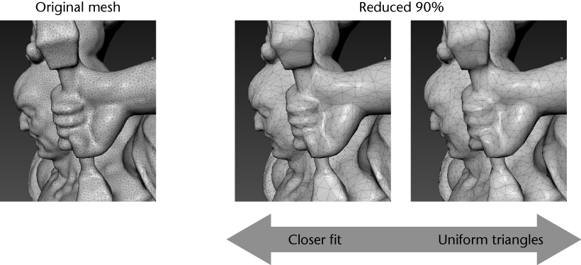 By default, Mudbox aims for Closer fit (a value of 0.0), meaning the resulting triangle faces are created primarily to preserve the shape of the original mesh, as closely as possible. The general shape of the mesh is preserved, but the resulting triangles can vary widely in size (possibly including long, skinny triangles).