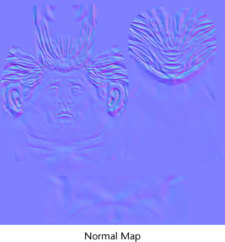 A normal map is a 2D RGB image that records the surface normal information for a mesh by using the red, green, blue color channels to record the X, Y, Z normal vector data. Each pixel in the extracted RGB image records the normal direction data and is used to determine lighting and shading on the low resolution surface when it is rendered. When you view a normal map on its own it appears in color (compared to a displacement map which has gray tones).
