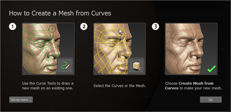 This window displays when you click Help in the Create Mesh From Curves window, or if Mudbox detects certain types of problems as you work on creating a mesh from curves.