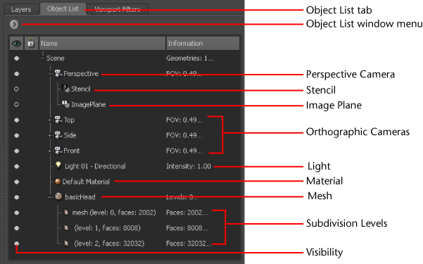 The Object List displays all objects in the 3D View available for viewing, selecting, and editing.