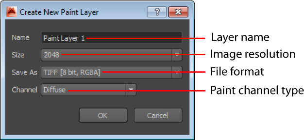 Select the Size (resolution) for the image by selecting a number that represents the number of pixels along X and Y for the image (square aspect ratio - 256, 512, 1024, 2048 (default), 4096, or 8192). The larger the image, the finer and sharper the detail you can apply when painting.