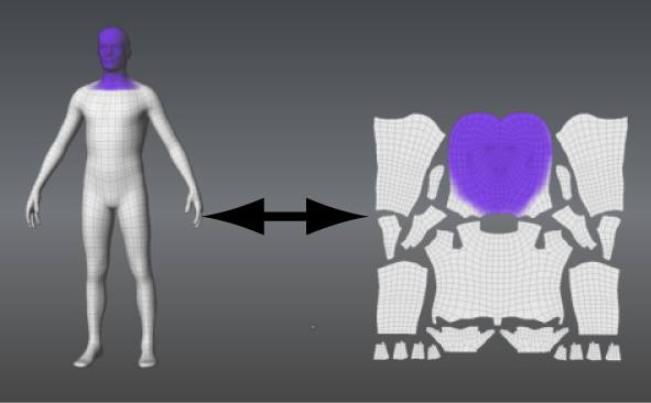 In some cases, it’s useful to paint on a flattened version of your model (as it appears in the UV View).