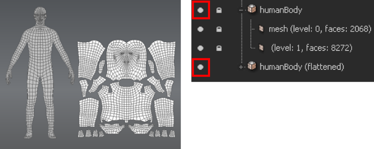 Flatten to UV Space creates a copy of the selected model with vertex positions that are identical to the UV texture coordinates of the original 3D model, so you can paint or edit your textures on the flattened version. The original model is temporarily invisible to let you paint on the 2D copy.