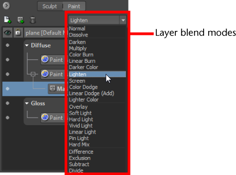 Layer blend modes let you combine and display the content of one or more paint layers in combination and change the visual characteristics of the final composite paint layer (texture map).