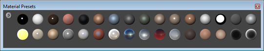 A number of pre-made materials are available from the Materials Presets tray. Click an item in the tray to apply it to your active model in the 3D View. These can be useful if you’ve never worked with materials before.