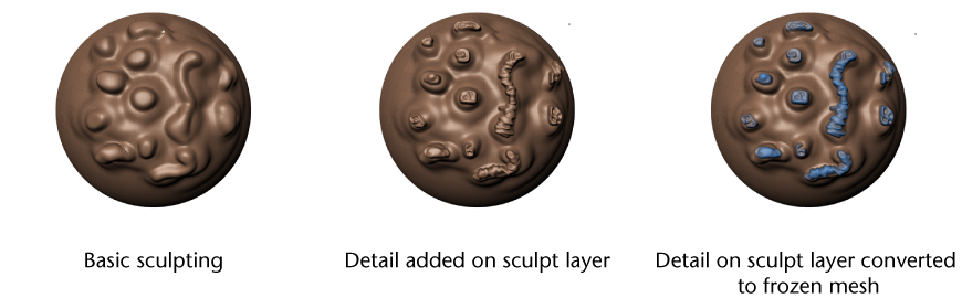 Mudbox assigns a freeze value to each vertex affected by the current sculpt layer. The levels of freezing are determined by the relative displacement of each vertex compared to the vertex with the greatest displacement, which receives maximum freezing.