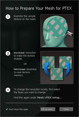 The basic instructions invite you to examine the sample texture pattern on your mesh, then use the PTEX Setup window (which displays simultaneously) to increase or decrease the resolution as necessary. The sample pattern displaying on your mesh is designed to make jagged texture edges as visible as possible, helping you define the right resolution. For more detailed instructions, see Prepare a model for PTEX painting.