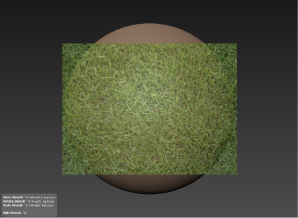 Mudbox loads the grass image as a stencil at the center of the 3D View. If the grass image fills the entire 3D View, press the S key while right-dragging to scale the stencil smaller. For more information, see Move rotate or scale a stencil.