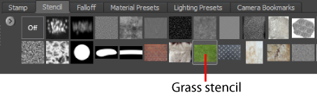 The grass stencil disappears as you stroke and paint is projected onto the model based on the stencil image. The stencil reappears after each stroke.