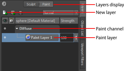 Layers window displays both sculpt and paint layers, depending on which display option you select at the top of the window.