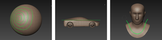 There are two types of curve in Mudbox. 3D curves are drawn directly on the surface of a model, and stay with the model as you zoom, tumble, and otherwise change your perspective on the scene. 2D curves are drawn on the view plane (as if drawn on glass in front of your model), and they stay in place as you adjust your view.