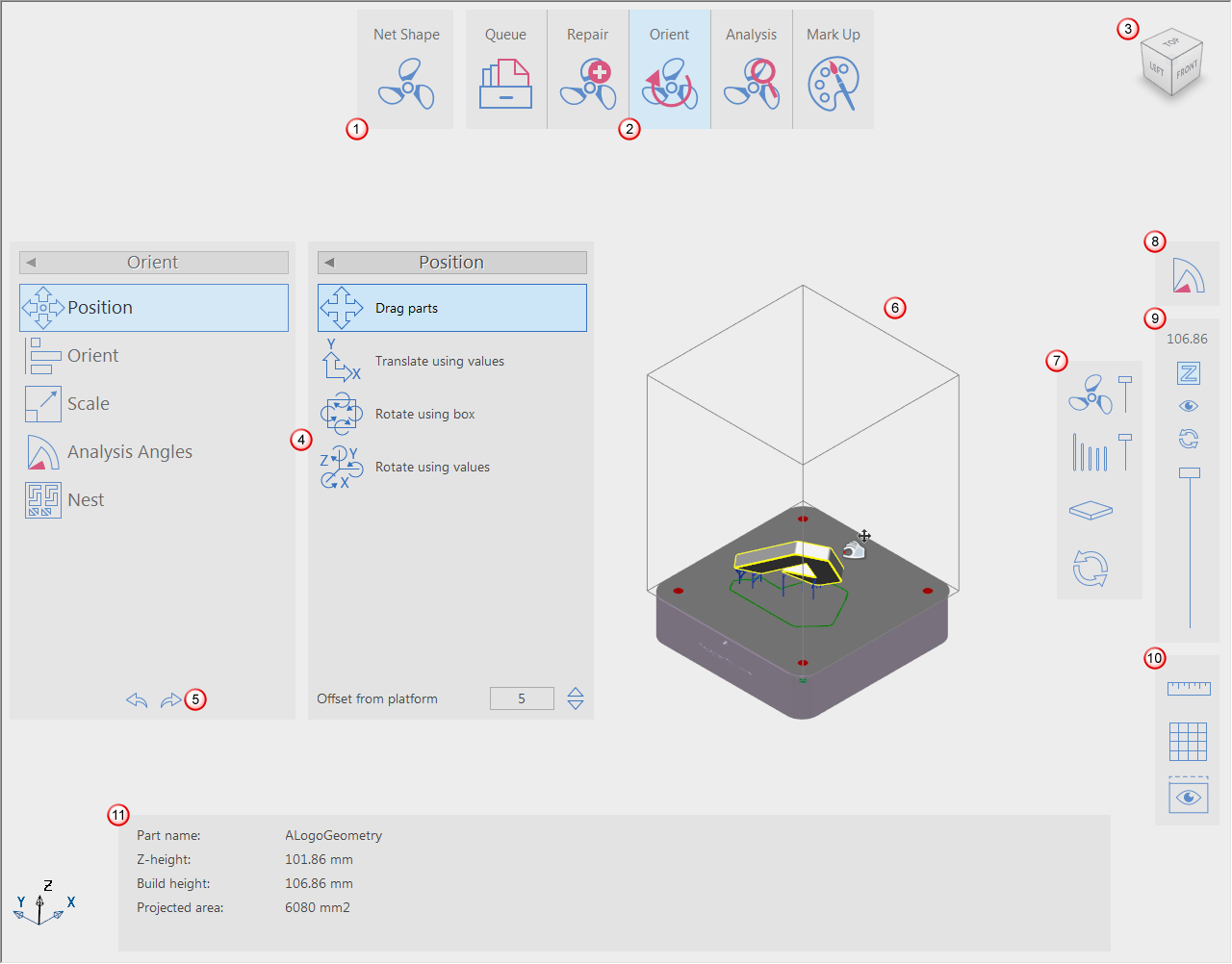 Use these toolbar buttons to measure distances, display a secondary view, and to control the display of dimensions and the grid on the platform. |