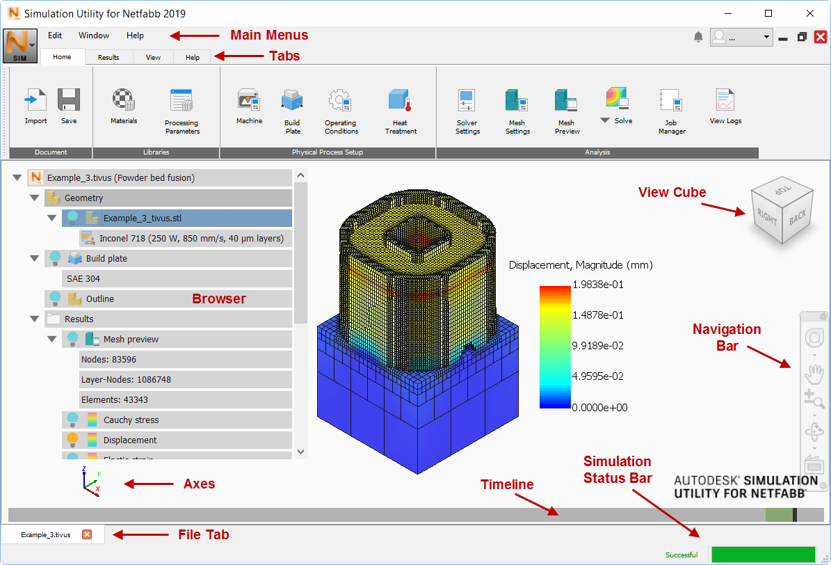 - Timeline shows the stages of the simulation, such as printing, cooldown, and substrate removal. Slide your cursor along the line to see a label for each operation, including the time stamp and increment number.