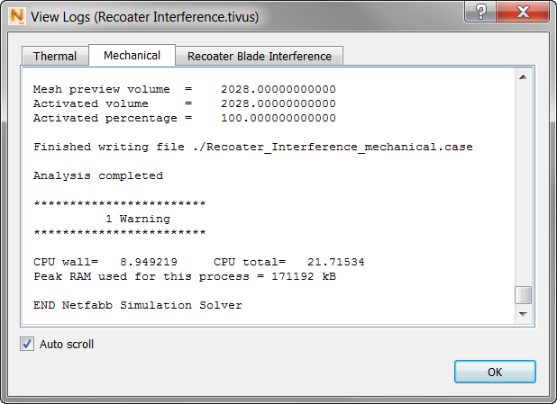 These log files are an invaluable diagnostic tool. Especially notable are errors that prevent the simulation from completing, and warnings such as recoater blade interface and support structure failure. It is a good practice to check these logs during or after every simulation. If the simulation does not complete, the log files open automatically.