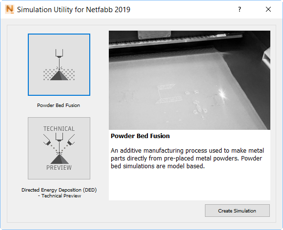 - Click the type of simulation you are preparing, Powder Bed Fusion or Directed Energy Deposition (DED), then click Create Simulation.