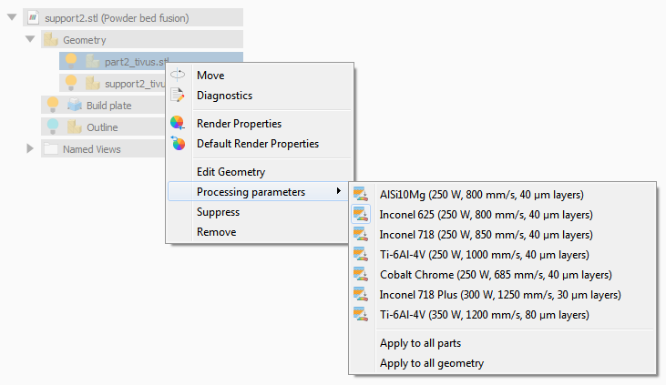 Per geometry option provides the freedom to assign PRM files separately to each part and each support in the build by right-clicking the geometry in the Browser.