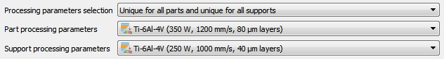Unique for all parts and unique for all supports opens separate Processing Parameters selection menus for parts and supports.