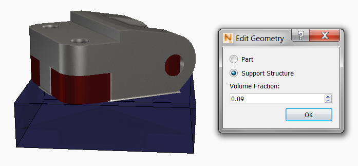Volume Fraction is automatically calculated during support creation. Volume fraction is the amount of the support volume that is occupied by physical structures rather than empty space. Leave the existing value unchanged.