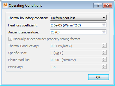 If Conduction to Loose Powder has been selected, users can manually select the property scaling properties that are used to estimate the thermal and mechanical properties of the powder from the component material properties.