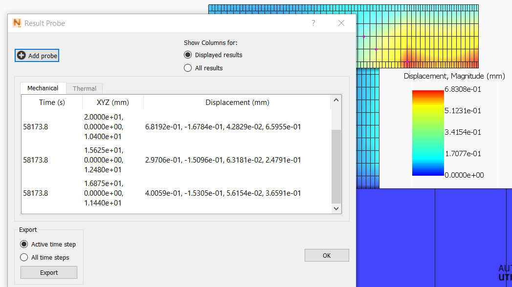 In the Result Probe dialog, you can use the Export controls to export the Result Probe table values in CSV format for use in spreadsheets, plots, and other forms of post-process analysis. Choose to export values for only the displayed increment (time step), or for the entire simulation.