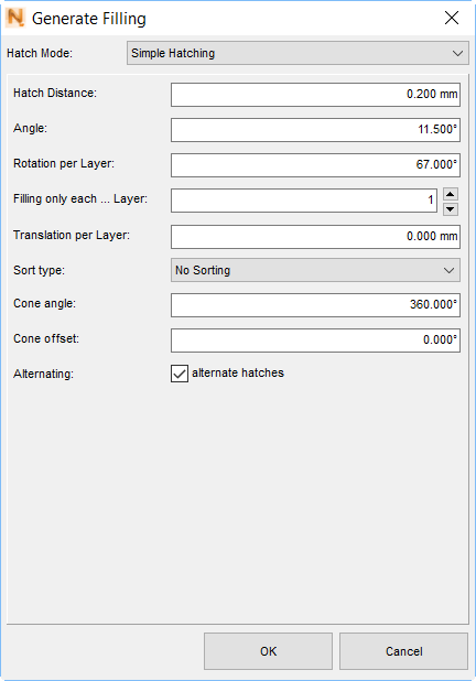 Slicing produces only the outside contour of each slice. Hatching must be added to create the laser vectors.