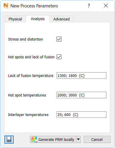 Best practices - To determine what interlayer temperatures are necessary it is suggested that the part level geometry or geometries that are of interest for that combination of processing conditions are simulated first using a standard stress and distortion PRM and choosing the Thermal only analysis type on the Analysis tab of the Solver Settings dialog. Determine from the simulation(s) the peak temperatures that may be experienced. This should be used for the upper interlayer temperatures, rounded up to the next 100° C. The lowest temperature should be set to the ambient temperature, typically 25º C. To determine what other temperatures should be used, plot the thermal properties of the material in question with respect to temperature. Add additional interlayer temperatures where observable non-linearities occur.