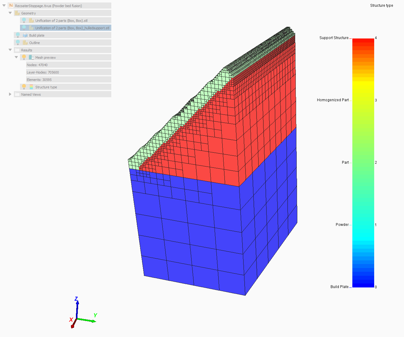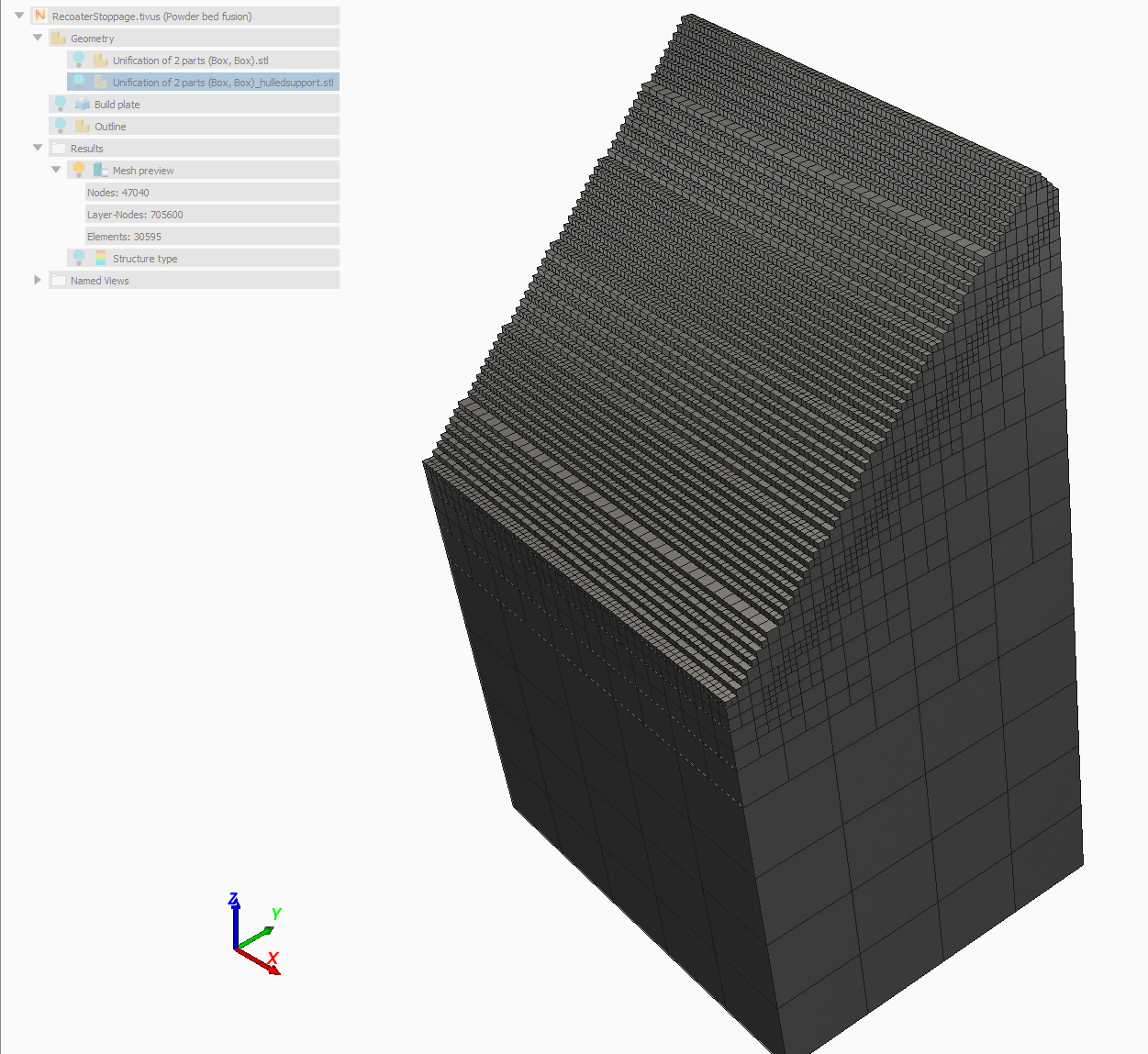 Click to generate a mesh preview of the active part and build plate. If the project has not already been saved, a prompt will appear to save the project before the mesh preview is begun. Performing a mesh preview is useful to ensure the mesh settings chosen create a voxel mesh that adequately captures the geometry of the part before committing to a full simulation. Mesh settings should be chosen so that the thinnest geometric feature has at least 2 elements through its thickness to ensure that the part can freely distort during simulation. Good FE practice includes performing a mesh convergence study for each geometry. Details about mesh settings and instructions on calculating mesh convergence can be found in the Mesh Settings topics for Powder Bed Fusion and Directed Energy Deposition.