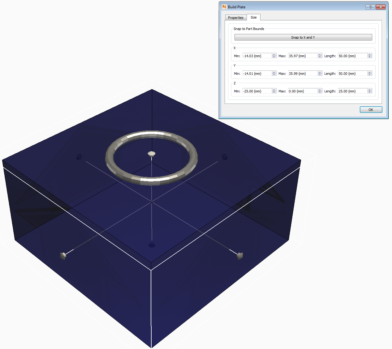 Adjustment fields for the X, Y, and Z dimensions are available on the Size tab. The Length settings for X and Y can be used to define a custom build plate region to mesh while the Z control for setting the build plate thickness. If you want the build plate to be a rectangle the same size as the model's bounding box, click Snap to X and Y. Using these settings will override the build plate size established using the Machine model setting in the Machine dialog.